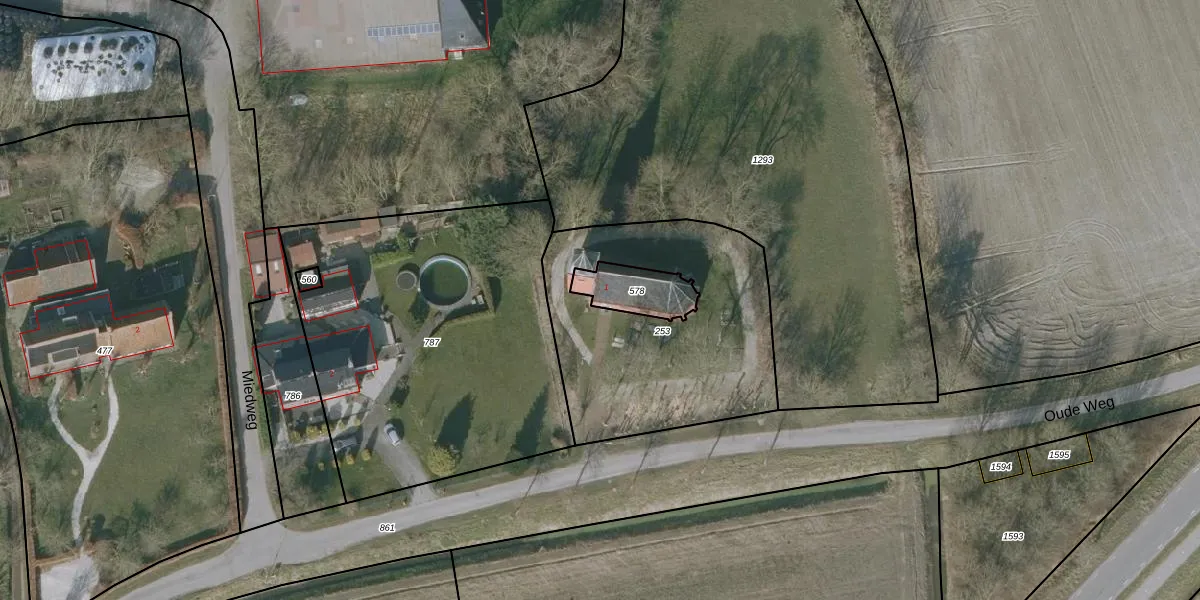 Oude Weg 1 is gelegen op kadastraal perceel RIE00XY578. Deze kadastrale aanduiding is uniek en wordt gebruikt door het Kadaster om eigendomsrechten en andere zakelijke rechten vast te leggen. Het perceel maakt onderdeel uit van de kadastrale gemeente Ried.