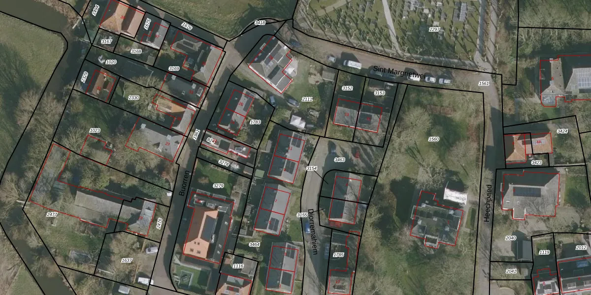 Het perceel waarop Diorremahiem 11 staat heeft een oppervlakte van 1100 m². Dit is een zeer groot perceel. De perceeloppervlakte wordt geregistreerd door het Kadaster. Gedetailleerde informatie over de maten van dit perceel kunt u vinden in het rapport Kadastrale kaart met maatvoering van Diorremahiem 11.