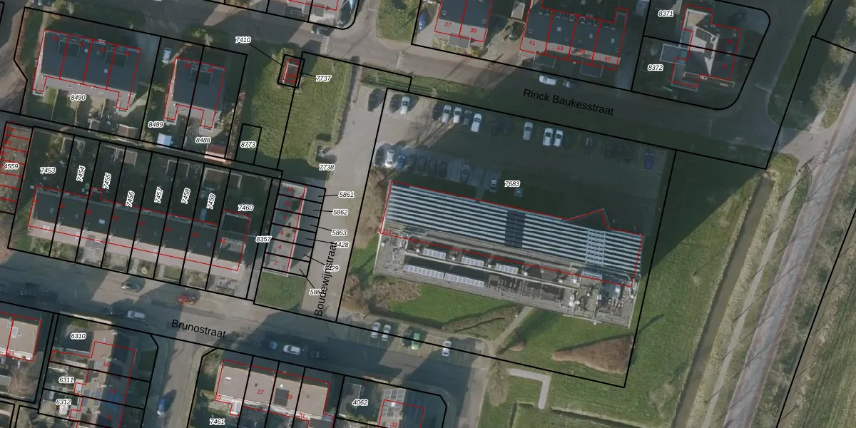 Het perceel waarop Boudewijnstraat 59 staat heeft een oppervlakte van 3900 m². Dit is een zeer groot perceel. De perceeloppervlakte wordt geregistreerd door het Kadaster. Gedetailleerde informatie over de maten van dit perceel kunt u vinden in het rapport Kadastrale kaart met maatvoering van Boudewijnstraat 59.