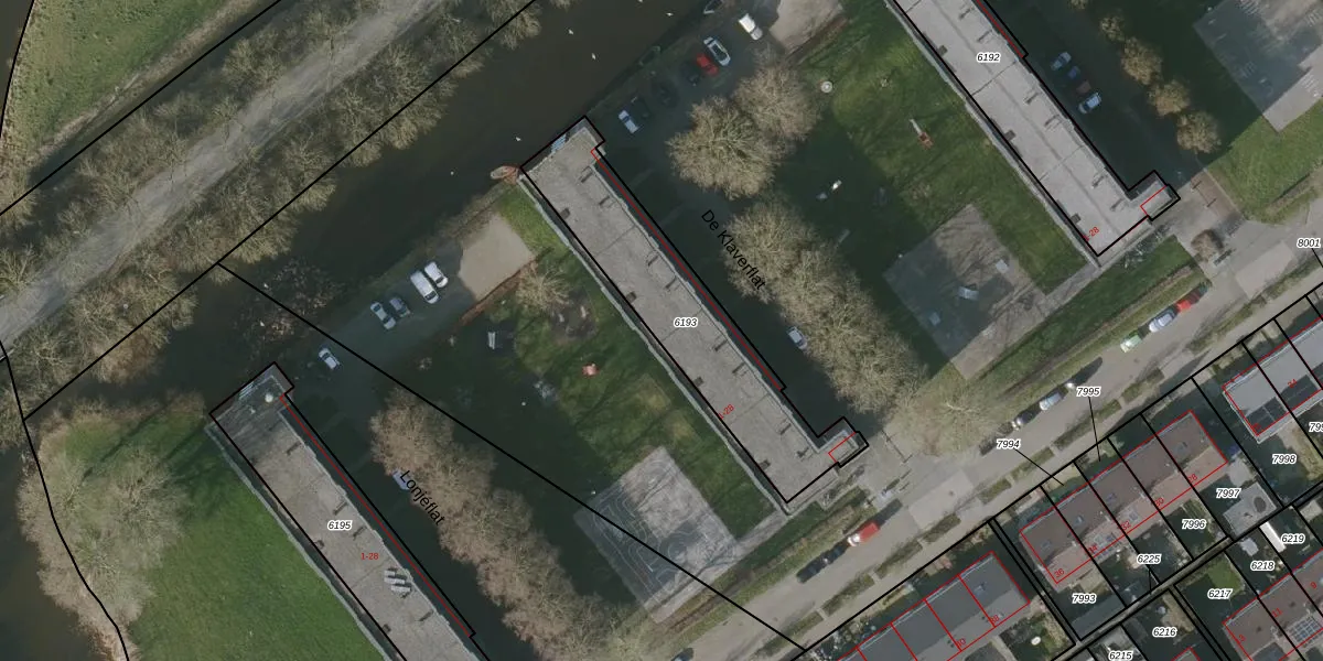 Het perceel waarop De Klaverflat 10 staat heeft een oppervlakte van 715 m². Dit is een groot perceel. De perceeloppervlakte wordt geregistreerd door het Kadaster. Gedetailleerde informatie over de maten van dit perceel kunt u vinden in het rapport Kadastrale kaart met maatvoering van De Klaverflat 10.