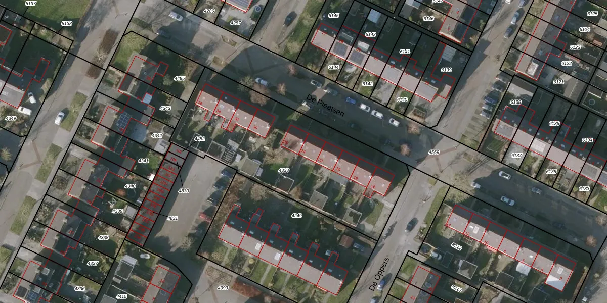Het perceel waarop De Pleatsen 24 staat heeft een oppervlakte van 2043 m². Dit is een zeer groot perceel. De perceeloppervlakte wordt geregistreerd door het Kadaster. Gedetailleerde informatie over de maten van dit perceel kunt u vinden in het rapport Kadastrale kaart met maatvoering van De Pleatsen 24.