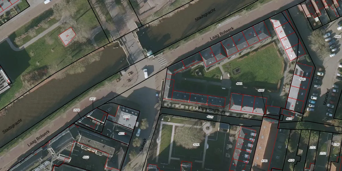 Het perceel waarop Klein Gasthuis 1 staat heeft een oppervlakte van 3301 m². Dit is een zeer groot perceel. De perceeloppervlakte wordt geregistreerd door het Kadaster. Gedetailleerde informatie over de maten van dit perceel kunt u vinden in het rapport Kadastrale kaart met maatvoering van Klein Gasthuis 1.
