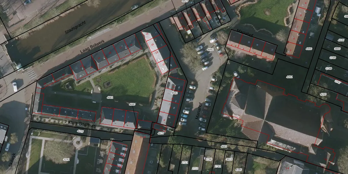 Het perceel waarop het adres ligt is BWD01-A-4682. De afkorting 'BWD01' staat voor kadastrale gemeente Bolsward. De gemiddelde perceelgrootte in Bolsward is 1701,33 m². Dit perceel is kleiner: de perceeloppervlakte bedraagt 462 m². Het kleinste perceel in de kadastrale gemeente is 0 m² groot. De grootste perceeloppervlakte is 14,5 ha. Op het perceel zijn 4 adressen aanwezig. In de Basisregistratie Kadaster (BRK) werden de grenzen van het perceel geregistreerd op 04-03-2011.