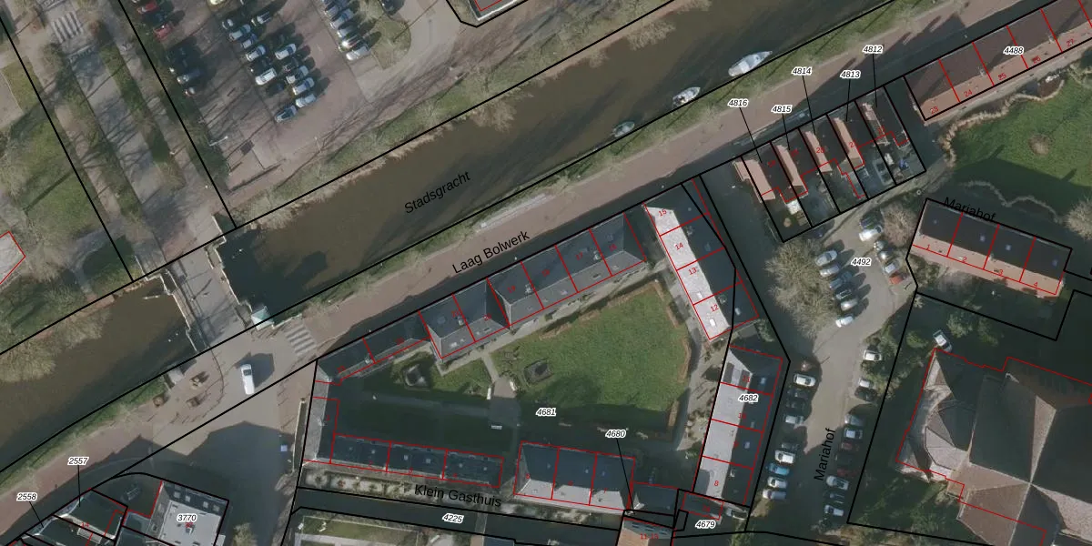 Het perceel waarop het adres ligt is BWD01-A-4681. De afkorting 'BWD01' staat voor kadastrale gemeente Bolsward. Het perceel is met 3301 m² relatief groot. Het gemiddelde ligt in de kadastrale gemeente Bolsward op 1701,33 m². Het grootste perceel in de kadastrale gemeente is 14,5 ha. Het kleinste perceel heeft een oppervlakte van 0 m². Er zijn 19 adressen aanwezig op het perceel. De laatste wijziging in het de Basisregistratie Kadaster (BRK) was op 04-03-2011.
