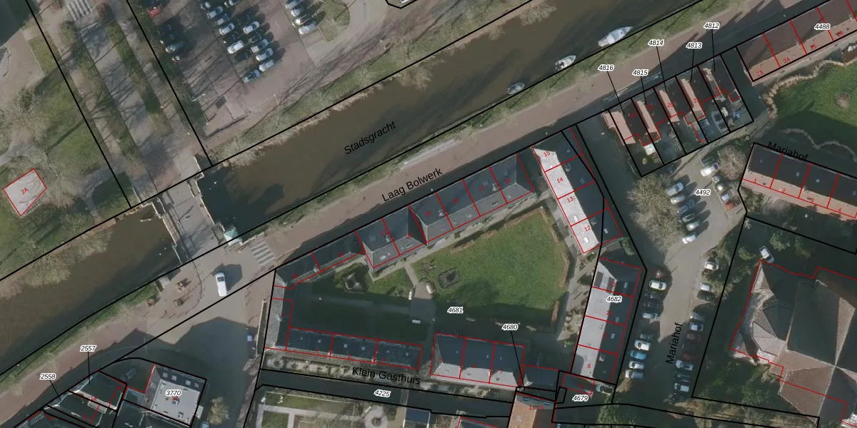 Het perceel waarop het adres ligt is BWD01-A-4681. De afkorting 'BWD01' staat voor kadastrale gemeente Bolsward. Het perceel is met 3301 m² relatief groot. Het gemiddelde ligt in de kadastrale gemeente Bolsward op 1701,33 m². Het grootste perceel in de kadastrale gemeente is 14,5 ha. Het kleinste perceel heeft een oppervlakte van 0 m². Er zijn 19 adressen aanwezig op het perceel. De huidige grenzen van het perceel zijn digitaal in de Basisregistratie Kadaster (BRK) geregistreerd op 04-03-2011.