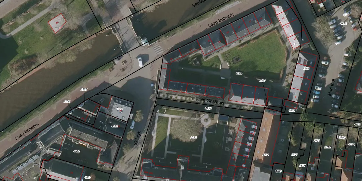 Het perceel waarop Klein Gasthuis 2 staat heeft een oppervlakte van 3301 m². Dit is een zeer groot perceel. De perceeloppervlakte wordt geregistreerd door het Kadaster. Gedetailleerde informatie over de maten van dit perceel kunt u vinden in het rapport Kadastrale kaart met maatvoering van Klein Gasthuis 2.