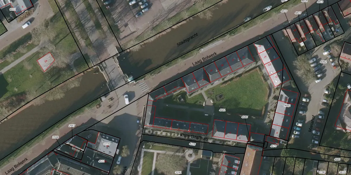 Het perceel waarop Klein Gasthuis 22 staat heeft een oppervlakte van 3301 m². Dit is een zeer groot perceel. De perceeloppervlakte wordt geregistreerd door het Kadaster. Gedetailleerde informatie over de maten van dit perceel kunt u vinden in het rapport Kadastrale kaart met maatvoering van Klein Gasthuis 22.