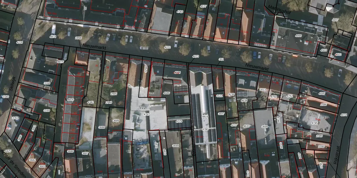 Het perceel waarop Nieuwmarkt 19 staat heeft een oppervlakte van 252 m². Dit is een middelgroot perceel. De perceeloppervlakte wordt geregistreerd door het Kadaster. Gedetailleerde informatie over de maten van dit perceel kunt u vinden in het rapport Kadastrale kaart met maatvoering van Nieuwmarkt 19.