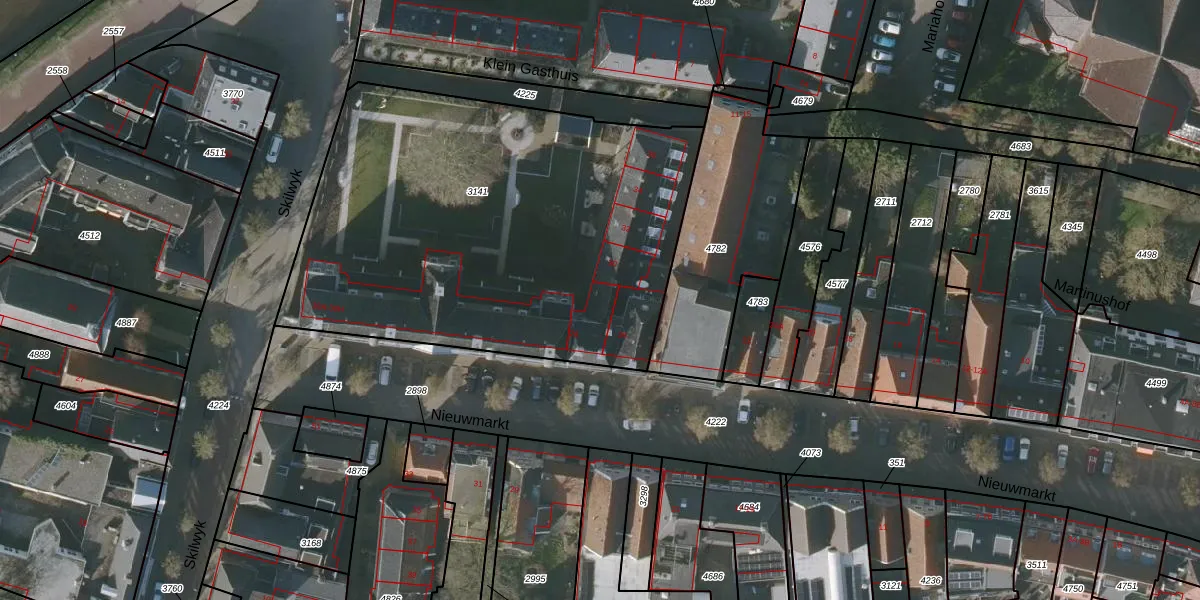 Het perceel waarop Nieuwmarkt 28 staat heeft een oppervlakte van 2495 m². Dit is een zeer groot perceel. De perceeloppervlakte wordt geregistreerd door het Kadaster. Gedetailleerde informatie over de maten van dit perceel kunt u vinden in het rapport Kadastrale kaart met maatvoering van Nieuwmarkt 28.
