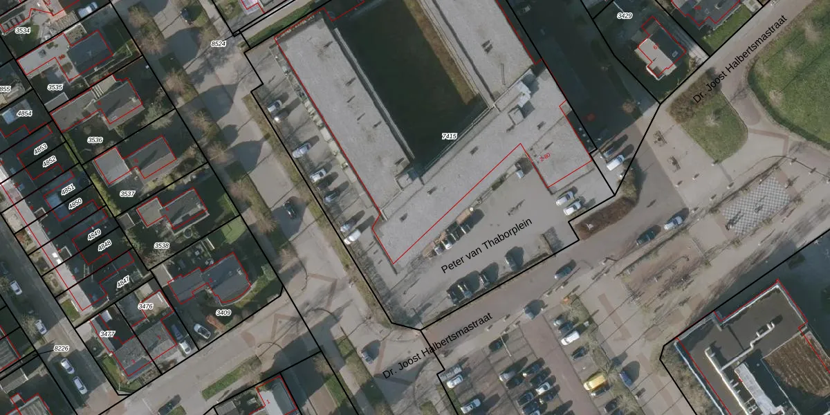 Het perceel waarop Peter van Thaborplein 4 staat heeft een oppervlakte van 4950 m². Dit is een zeer groot perceel. De perceeloppervlakte wordt geregistreerd door het Kadaster. Gedetailleerde informatie over de maten van dit perceel kunt u vinden in het rapport Kadastrale kaart met maatvoering van Peter van Thaborplein 4.