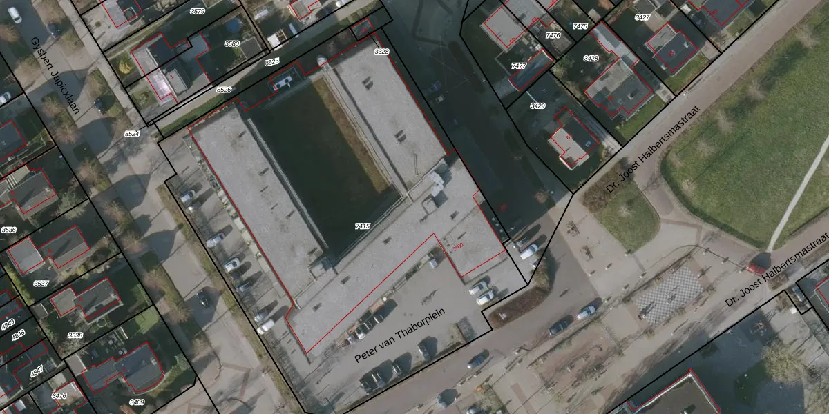 Het perceel waarop Peter van Thaborplein 62 staat heeft een oppervlakte van 4950 m². Dit is een zeer groot perceel. De perceeloppervlakte wordt geregistreerd door het Kadaster. Gedetailleerde informatie over de maten van dit perceel kunt u vinden in het rapport Kadastrale kaart met maatvoering van Peter van Thaborplein 62.