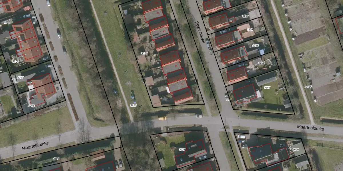 Het perceel waarop Bosschawei 57 staat heeft een oppervlakte van 1940 m². Dit is een zeer groot perceel. De perceeloppervlakte wordt geregistreerd door het Kadaster. Gedetailleerde informatie over de maten van dit perceel kunt u vinden in het rapport Kadastrale kaart met maatvoering van Bosschawei 57.