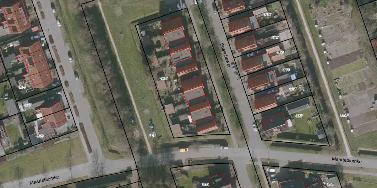 Het perceel waarop Bosschawei 61 staat heeft een oppervlakte van 1940 m². Dit is een zeer groot perceel. De perceeloppervlakte wordt geregistreerd door het Kadaster. Gedetailleerde informatie over de maten van dit perceel kunt u vinden in het rapport Kadastrale kaart met maatvoering van Bosschawei 61.