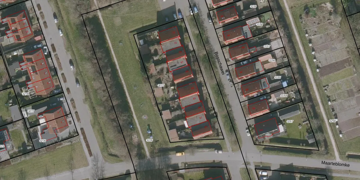 Het perceel waarop Bosschawei 63 staat heeft een oppervlakte van 1940 m². Dit is een zeer groot perceel. De perceeloppervlakte wordt geregistreerd door het Kadaster. Gedetailleerde informatie over de maten van dit perceel kunt u vinden in het rapport Kadastrale kaart met maatvoering van Bosschawei 63.