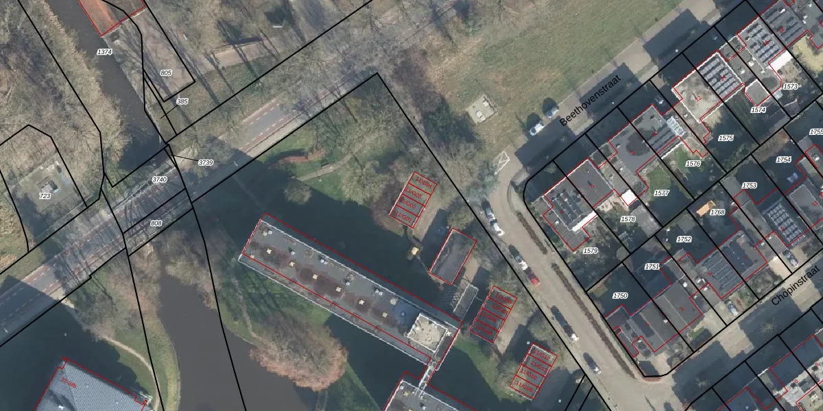 Het perceel waarop Beethovenstraat 11-G02 staat heeft een oppervlakte van 7400 m². Dit is een zeer groot perceel. De perceeloppervlakte wordt geregistreerd door het Kadaster. Gedetailleerde informatie over de maten van dit perceel kunt u vinden in het rapport Kadastrale kaart met maatvoering van Beethovenstraat 11-G02.