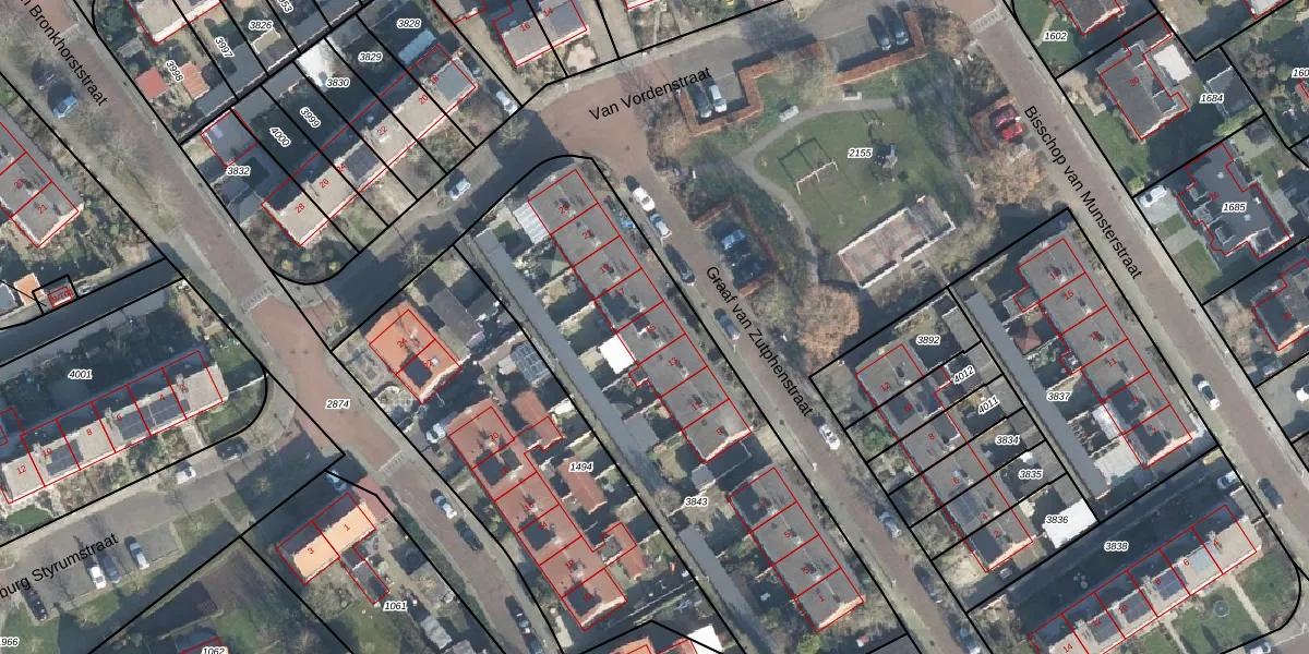 Het perceel waarop Graaf van Zutphenstraat 15 staat heeft een oppervlakte van 2024 m². Dit is een zeer groot perceel. De perceeloppervlakte wordt geregistreerd door het Kadaster. Gedetailleerde informatie over de maten van dit perceel kunt u vinden in het rapport Kadastrale kaart met maatvoering van Graaf van Zutphenstraat 15.