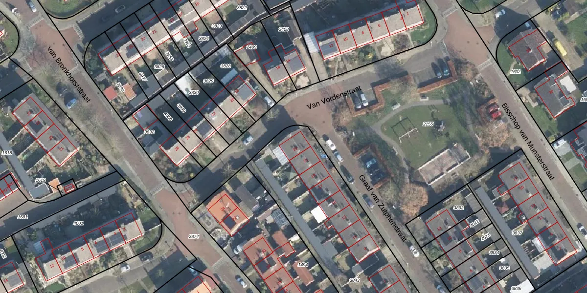 Het perceel waarop Graaf van Zutphenstraat 23 staat heeft een oppervlakte van 2024 m². Dit is een zeer groot perceel. De perceeloppervlakte wordt geregistreerd door het Kadaster. Gedetailleerde informatie over de maten van dit perceel kunt u vinden in het rapport Kadastrale kaart met maatvoering van Graaf van Zutphenstraat 23.