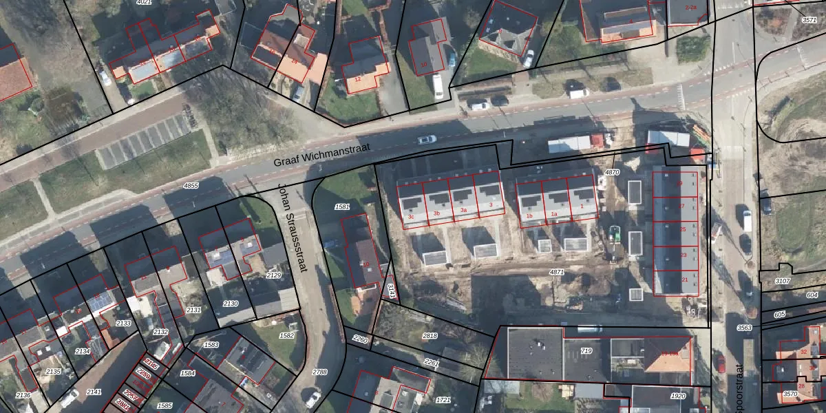Het perceel waarop Graaf Wichmanstraat 3-c staat heeft een oppervlakte van 3143 m². Dit is een zeer groot perceel. De perceeloppervlakte wordt geregistreerd door het Kadaster. Gedetailleerde informatie over de maten van dit perceel kunt u vinden in het rapport Kadastrale kaart met maatvoering van Graaf Wichmanstraat 3-c.