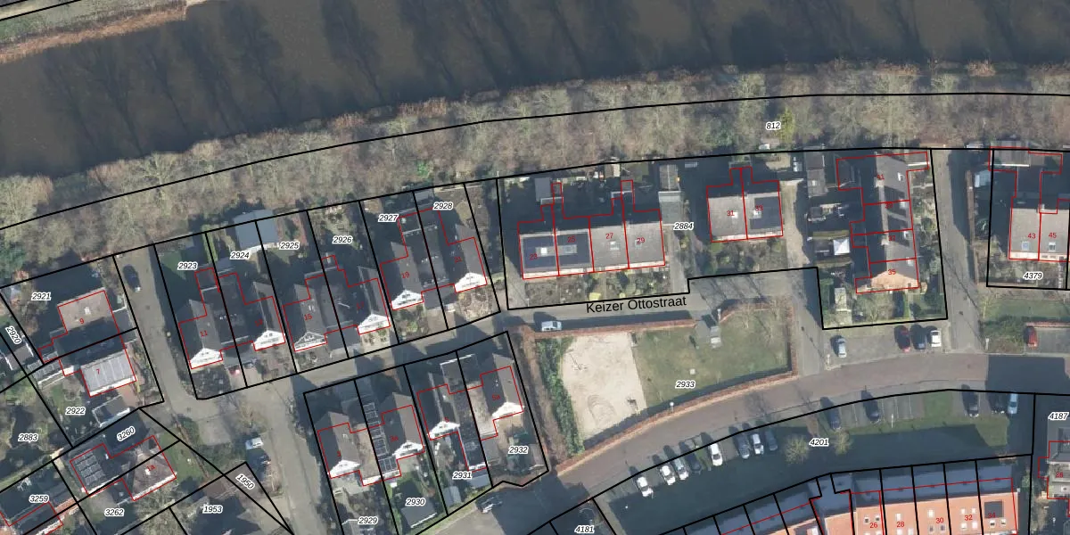 Het perceel waarop Keizer Ottostraat 23 staat heeft een oppervlakte van 2165 m². Dit is een zeer groot perceel. De perceeloppervlakte wordt geregistreerd door het Kadaster. Gedetailleerde informatie over de maten van dit perceel kunt u vinden in het rapport Kadastrale kaart met maatvoering van Keizer Ottostraat 23.
