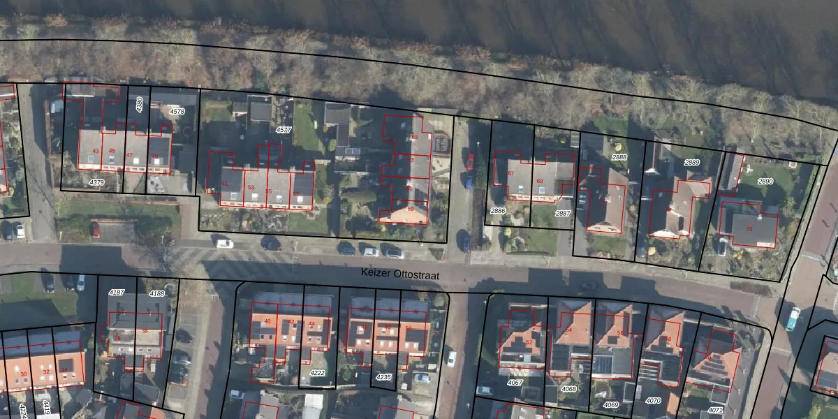 Het perceel waarop Keizer Ottostraat 59 staat heeft een oppervlakte van 1955 m². Dit is een zeer groot perceel. De perceeloppervlakte wordt geregistreerd door het Kadaster. Gedetailleerde informatie over de maten van dit perceel kunt u vinden in het rapport Kadastrale kaart met maatvoering van Keizer Ottostraat 59.