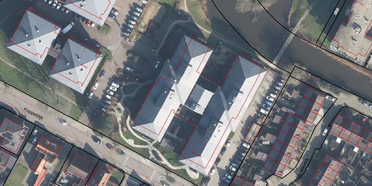Het perceel waarop Koppeldijk 40-223 staat heeft een oppervlakte van 1,5 ha. Dit is een zeer groot perceel. De perceeloppervlakte wordt geregistreerd door het Kadaster. Gedetailleerde informatie over de maten van dit perceel kunt u vinden in het rapport Kadastrale kaart met maatvoering van Koppeldijk 40-223.