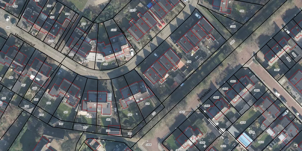 Het perceel waarop Morsmanshof 55 staat heeft een oppervlakte van 1676 m². Dit is een zeer groot perceel. De perceeloppervlakte wordt geregistreerd door het Kadaster. Gedetailleerde informatie over de maten van dit perceel kunt u vinden in het rapport Kadastrale kaart met maatvoering van Morsmanshof 55.