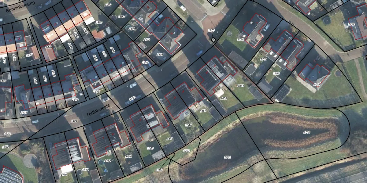 Tedinkweide 18 is gelegen op kadastraal perceel BCL00F1451. Deze kadastrale aanduiding is uniek en wordt gebruikt door het Kadaster om eigendomsrechten en andere zakelijke rechten vast te leggen. Het perceel maakt onderdeel uit van de kadastrale gemeente Borculo.
