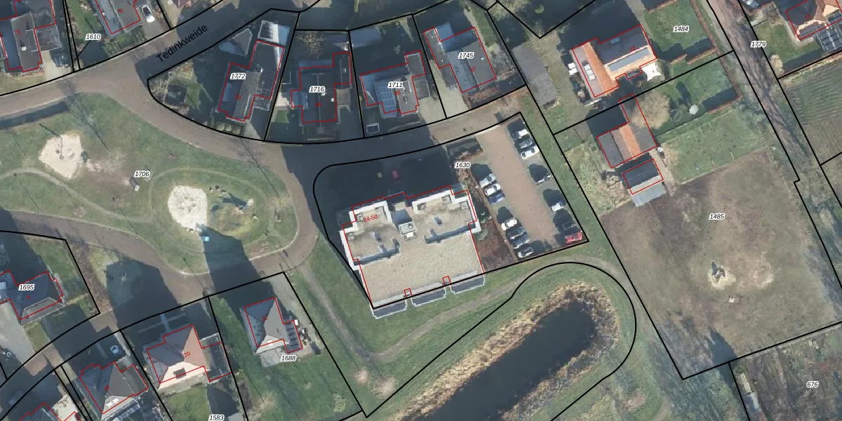 Het perceel waarop Tedinkweide 32 staat heeft een oppervlakte van 1807 m². Dit is een zeer groot perceel. De perceeloppervlakte wordt geregistreerd door het Kadaster. Gedetailleerde informatie over de maten van dit perceel kunt u vinden in het rapport Kadastrale kaart met maatvoering van Tedinkweide 32.