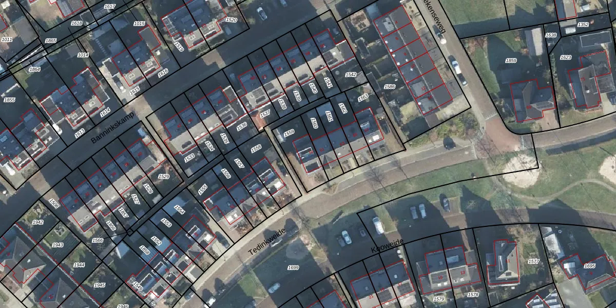 Tedinkweide 59 is gelegen op kadastraal perceel BCL00F1559. Deze kadastrale aanduiding is uniek en wordt gebruikt door het Kadaster om eigendomsrechten en andere zakelijke rechten vast te leggen. Het perceel maakt onderdeel uit van de kadastrale gemeente Borculo.