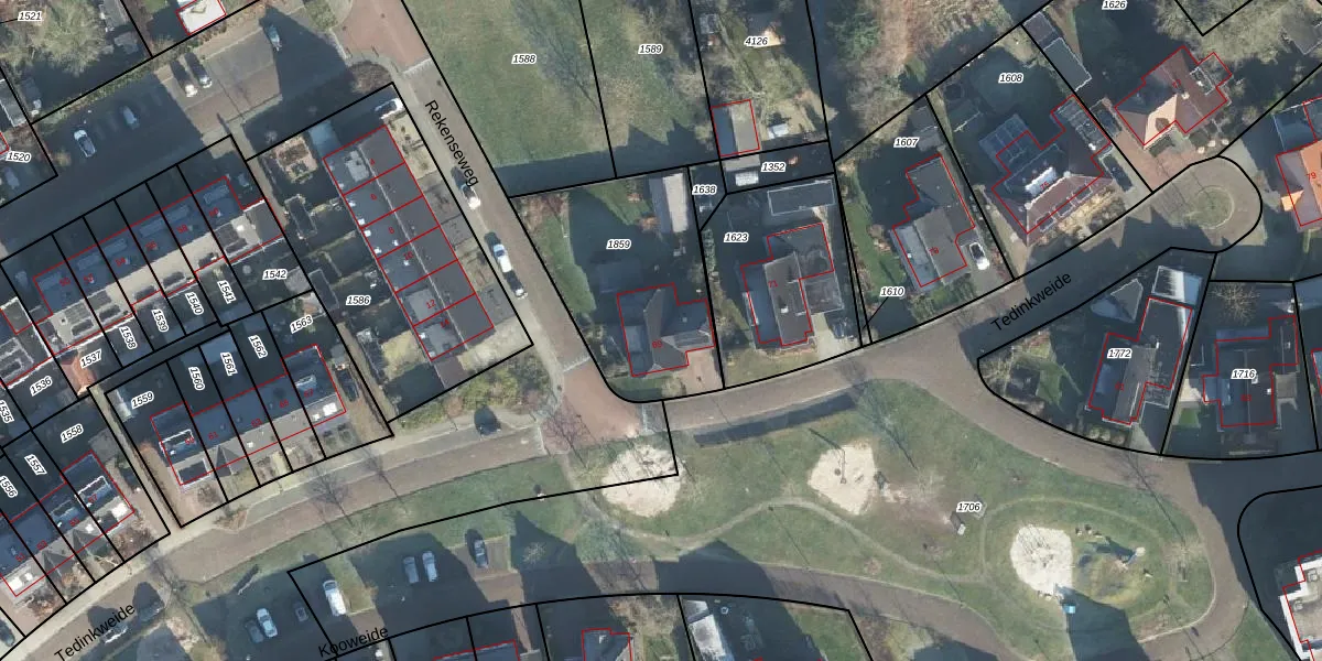 Het perceel waarop Tedinkweide 69 staat heeft een oppervlakte van 745 m². Dit is een groot perceel. De perceeloppervlakte wordt geregistreerd door het Kadaster. Gedetailleerde informatie over de maten van dit perceel kunt u vinden in het rapport Kadastrale kaart met maatvoering van Tedinkweide 69.