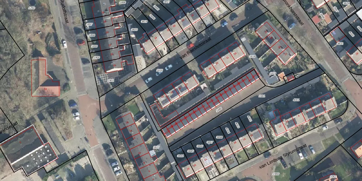 Het perceel waarop van Raesfeltstraat 39 staat heeft een oppervlakte van 2460 m². Dit is een zeer groot perceel. De perceeloppervlakte wordt geregistreerd door het Kadaster. Gedetailleerde informatie over de maten van dit perceel kunt u vinden in het rapport Kadastrale kaart met maatvoering van van Raesfeltstraat 39.