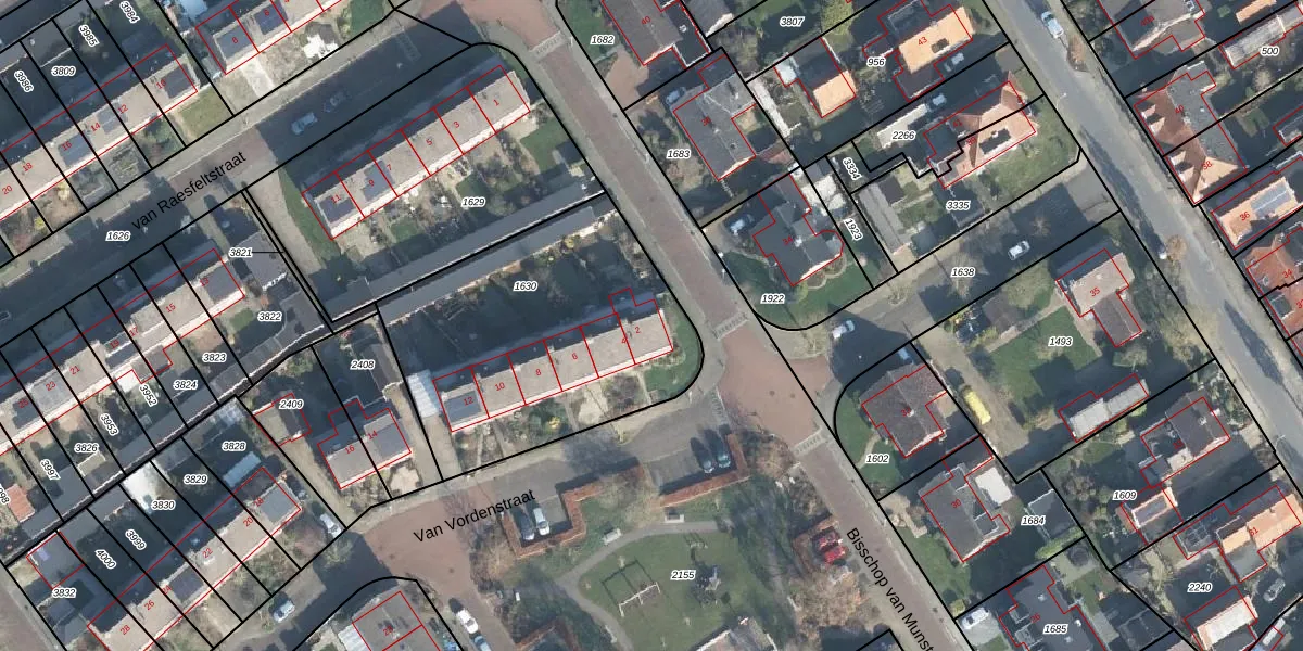 Het perceel waarop Van Vordenstraat 2 staat heeft een oppervlakte van 1340 m². Dit is een zeer groot perceel. De perceeloppervlakte wordt geregistreerd door het Kadaster. Gedetailleerde informatie over de maten van dit perceel kunt u vinden in het rapport Kadastrale kaart met maatvoering van Van Vordenstraat 2.