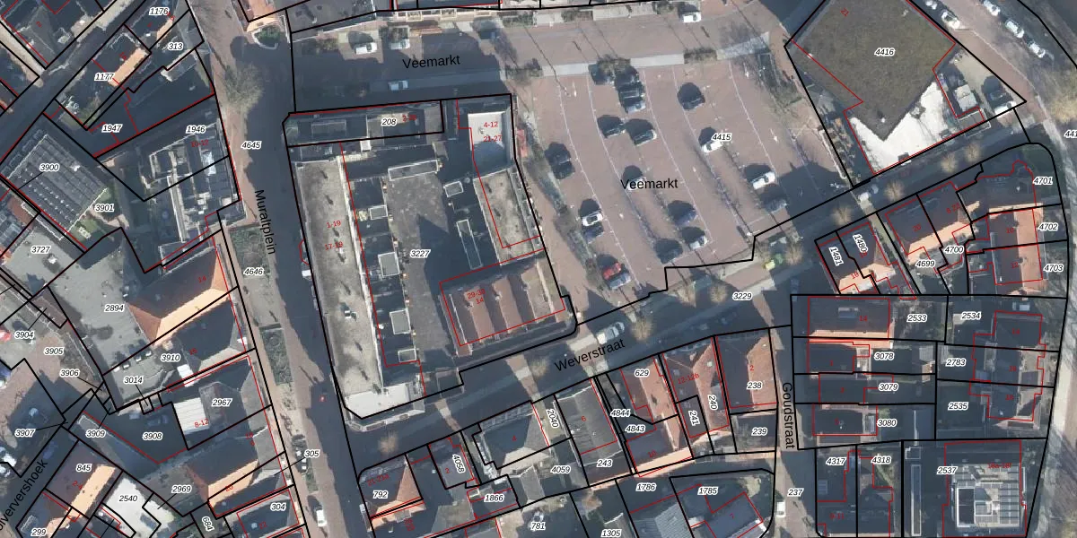 Het perceel waarop Veemarkt 14 staat heeft een oppervlakte van 2093 m². Dit is een zeer groot perceel. De perceeloppervlakte wordt geregistreerd door het Kadaster. Gedetailleerde informatie over de maten van dit perceel kunt u vinden in het rapport Kadastrale kaart met maatvoering van Veemarkt 14.