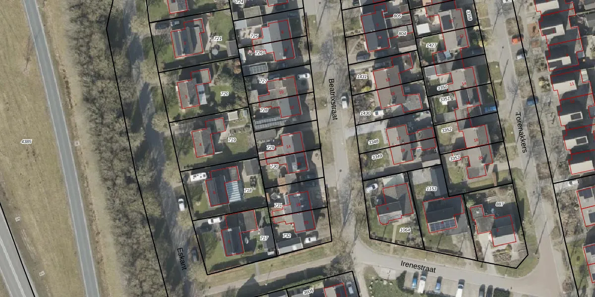 Het perceel waarop Beatrixstraat 14 staat heeft een oppervlakte van 200 m². Dit is een middelgroot perceel. De perceeloppervlakte wordt geregistreerd door het Kadaster. Gedetailleerde informatie over de maten van dit perceel kunt u vinden in het rapport Kadastrale kaart met maatvoering van Beatrixstraat 14.