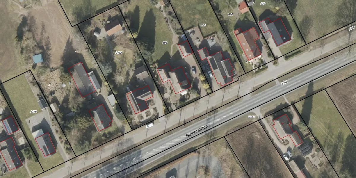 Het perceel waarop Buinerstraat 33 staat heeft een oppervlakte van 1799 m². Dit is een zeer groot perceel. De perceeloppervlakte wordt geregistreerd door het Kadaster. Gedetailleerde informatie over de maten van dit perceel kunt u vinden in het rapport Kadastrale kaart met maatvoering van Buinerstraat 33.