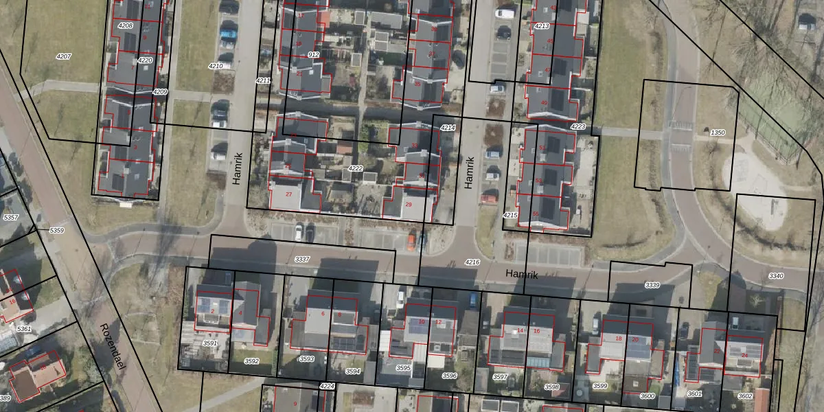 Het perceel waarop Hamrik 29 staat heeft een oppervlakte van 1709 m². Dit is een zeer groot perceel. De perceeloppervlakte wordt geregistreerd door het Kadaster. Gedetailleerde informatie over de maten van dit perceel kunt u vinden in het rapport Kadastrale kaart met maatvoering van Hamrik 29.