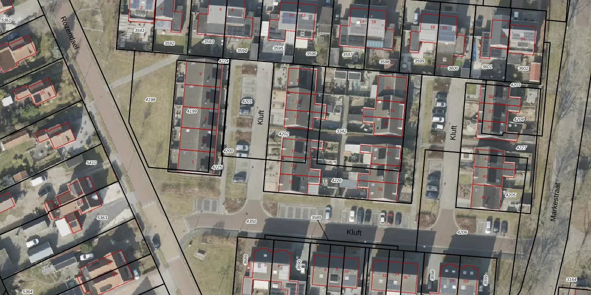 Het perceel waarop Kluft 17 staat heeft een oppervlakte van 443 m². Dit is een groot perceel. De perceeloppervlakte wordt geregistreerd door het Kadaster. Gedetailleerde informatie over de maten van dit perceel kunt u vinden in het rapport Kadastrale kaart met maatvoering van Kluft 17.