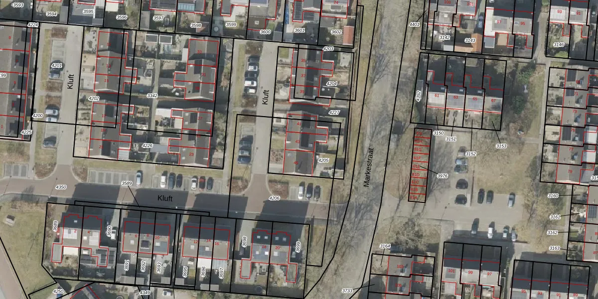 Het perceel waarop Kluft 43 staat heeft een oppervlakte van 416 m². Dit is een groot perceel. De perceeloppervlakte wordt geregistreerd door het Kadaster. Gedetailleerde informatie over de maten van dit perceel kunt u vinden in het rapport Kadastrale kaart met maatvoering van Kluft 43.