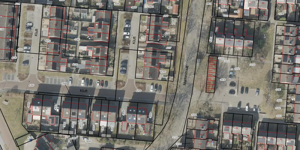 Het perceel waarop Kluft 45 staat heeft een oppervlakte van 416 m². Dit is een groot perceel. De perceeloppervlakte wordt geregistreerd door het Kadaster. Gedetailleerde informatie over de maten van dit perceel kunt u vinden in het rapport Kadastrale kaart met maatvoering van Kluft 45.