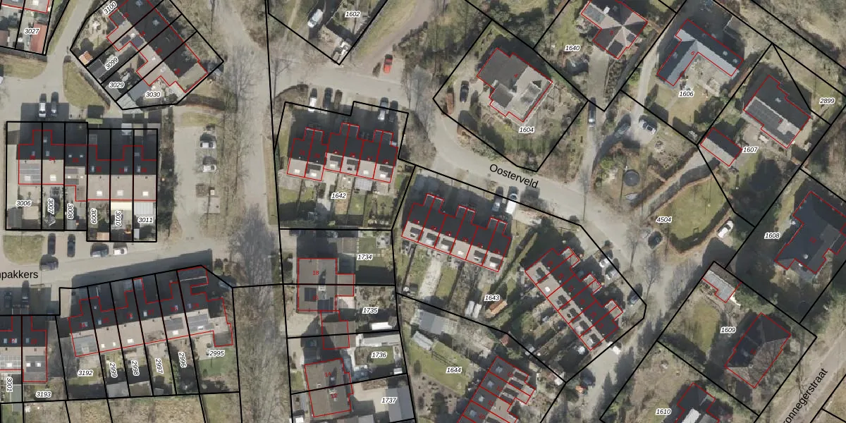 Het perceel waarop Oosterveld 25 staat heeft een oppervlakte van 1722 m². Dit is een zeer groot perceel. De perceeloppervlakte wordt geregistreerd door het Kadaster. Gedetailleerde informatie over de maten van dit perceel kunt u vinden in het rapport Kadastrale kaart met maatvoering van Oosterveld 25.