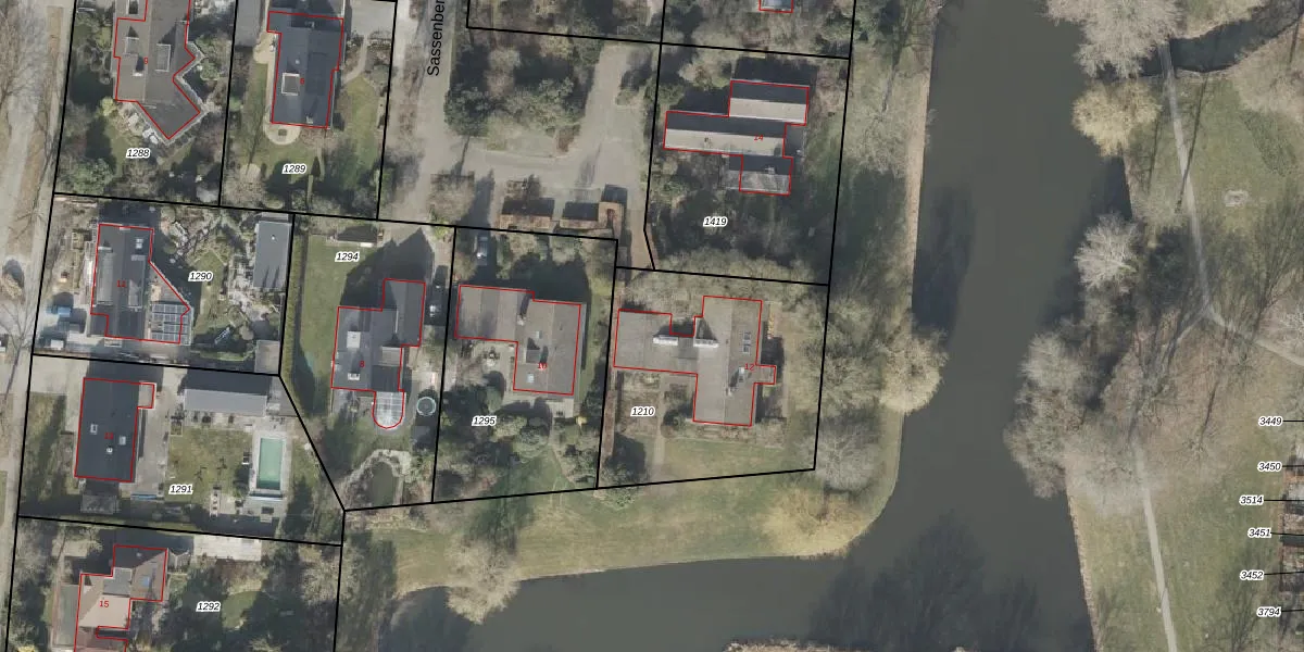 Het perceel waarop Sassenbergen 12 staat heeft een oppervlakte van 1029 m². Dit is een zeer groot perceel. De perceeloppervlakte wordt geregistreerd door het Kadaster. Gedetailleerde informatie over de maten van dit perceel kunt u vinden in het rapport Kadastrale kaart met maatvoering van Sassenbergen 12.