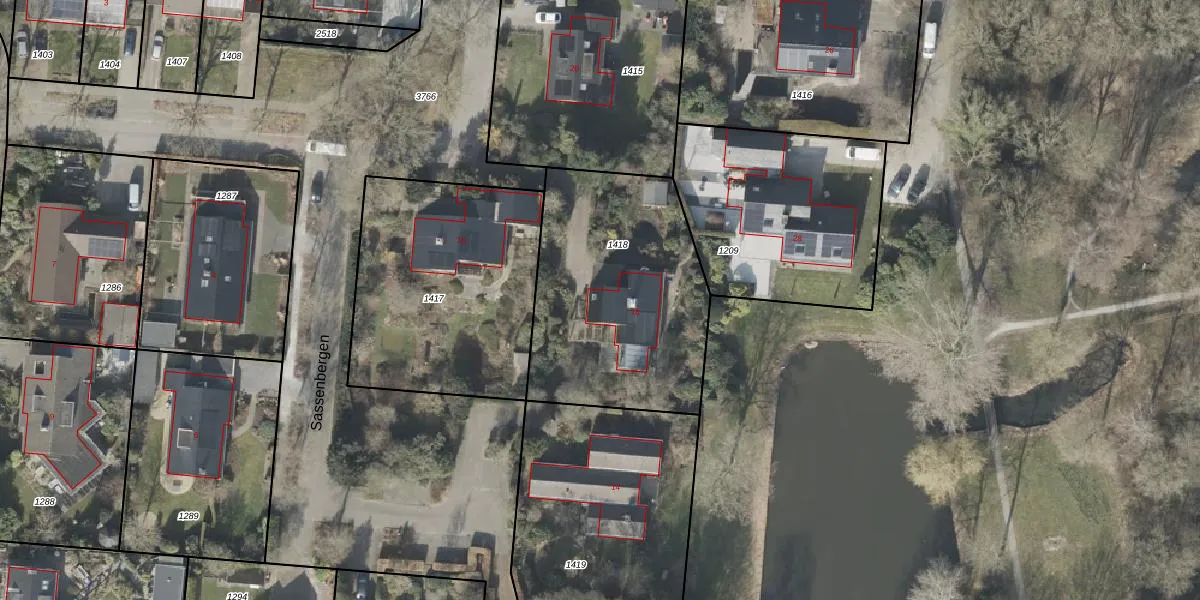 Het perceel waarop Sassenbergen 18 staat heeft een oppervlakte van 1050 m². Dit is een zeer groot perceel. De perceeloppervlakte wordt geregistreerd door het Kadaster. Gedetailleerde informatie over de maten van dit perceel kunt u vinden in het rapport Kadastrale kaart met maatvoering van Sassenbergen 18.