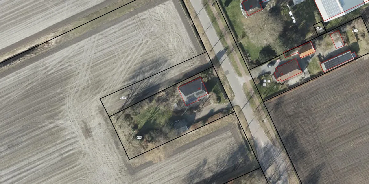 Het adres ligt op het perceel MTD01-E-420, dat zich in de kadastrale gemeente Muntendam bevindt. Het perceel is 1670 m² groot. Dat is kleiner dan de gemiddelde perceeloppervlakte in Muntendam, dat op 7394,07 m² ligt. Het grootste perceel in de kadastrale gemeente is 44,6 ha. Het kleinste perceel heeft een oppervlakte van 0 m². Op het perceel bevinden zich geen andere adressen. In de Basisregistratie Kadaster (BRK) werden de grenzen van het perceel geregistreerd op 30-03-2005.
