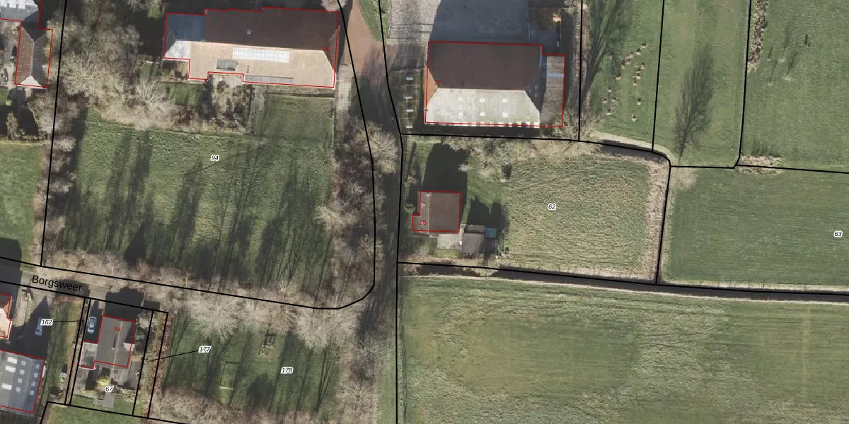 Het perceel waarop Borgsweer 28 staat heeft een oppervlakte van 1945 m². Dit is een zeer groot perceel. De perceeloppervlakte wordt geregistreerd door het Kadaster. Gedetailleerde informatie over de maten van dit perceel kunt u vinden in het rapport Kadastrale kaart met maatvoering van Borgsweer 28.
