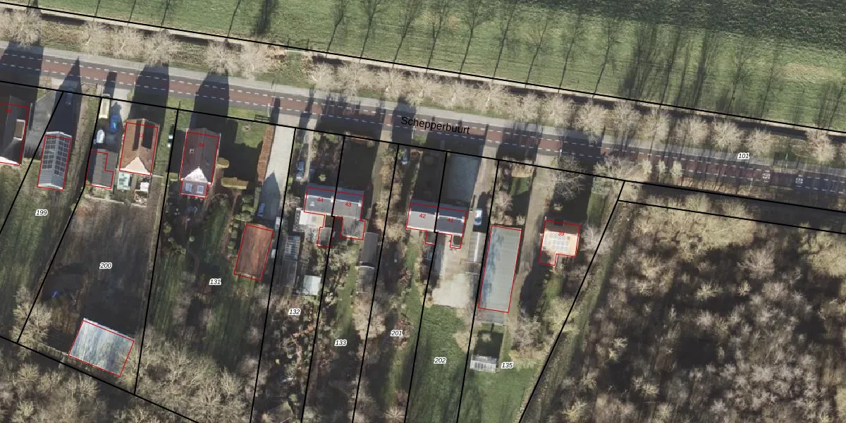 Het perceel waarop Schepperbuurt 42 staat heeft een oppervlakte van 1008 m². Dit is een zeer groot perceel. De perceeloppervlakte wordt geregistreerd door het Kadaster. Gedetailleerde informatie over de maten van dit perceel kunt u vinden in het rapport Kadastrale kaart met maatvoering van Schepperbuurt 42.