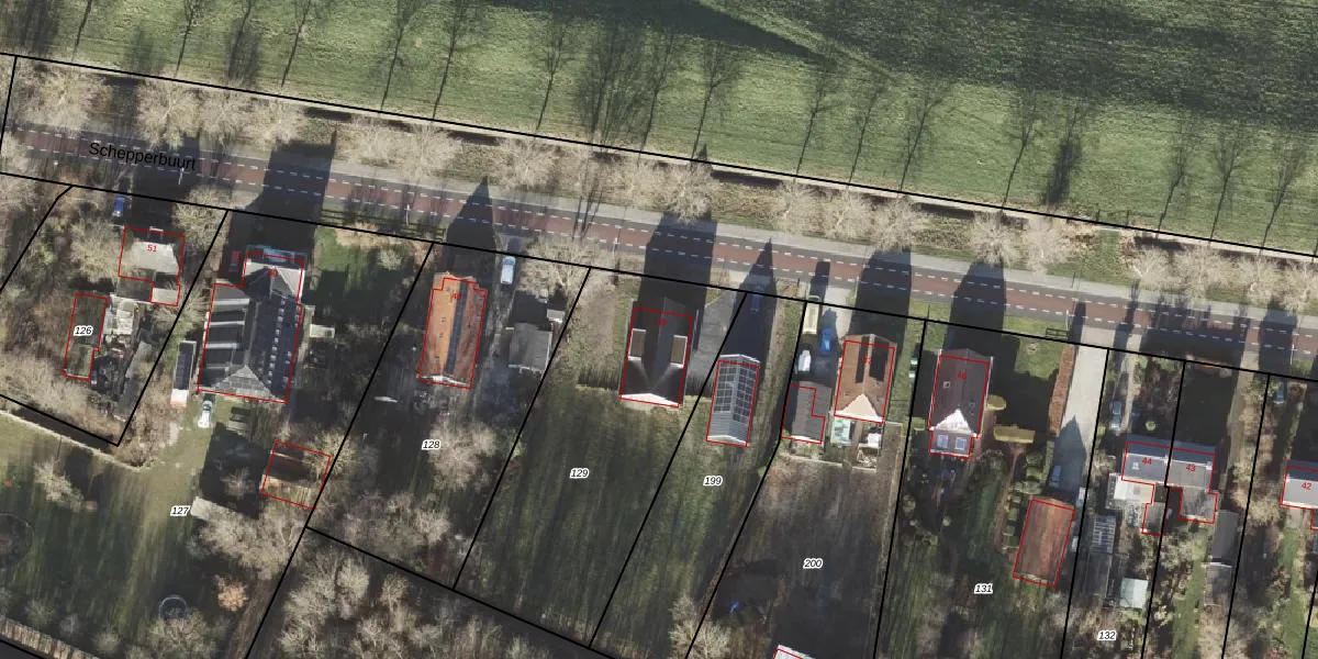 Het perceel waarop Schepperbuurt 48 staat heeft een oppervlakte van 1280 m². Dit is een zeer groot perceel. De perceeloppervlakte wordt geregistreerd door het Kadaster. Gedetailleerde informatie over de maten van dit perceel kunt u vinden in het rapport Kadastrale kaart met maatvoering van Schepperbuurt 48.