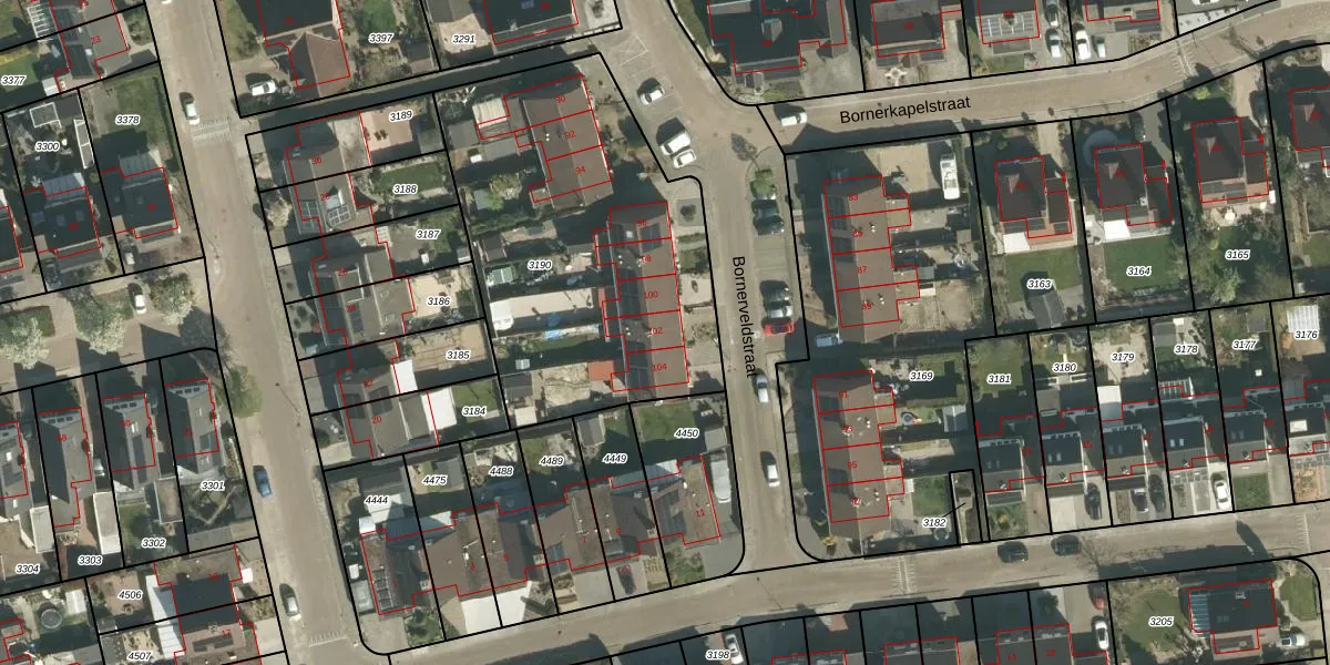 Bornerveldstraat 102 is gelegen op kadastraal perceel BOR00F3190. Deze kadastrale aanduiding is uniek en wordt gebruikt door het Kadaster om eigendomsrechten en andere zakelijke rechten vast te leggen. Het perceel maakt onderdeel uit van de kadastrale gemeente Born.