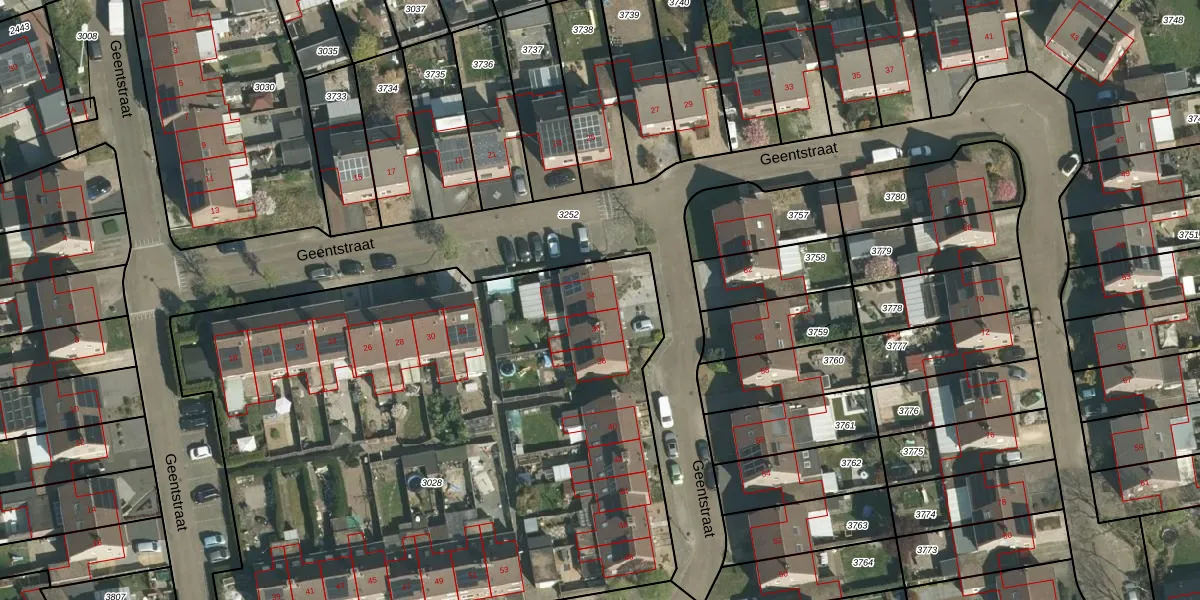 Het perceel waarop Geentstraat 34 staat heeft een oppervlakte van 4233 m². Dit is een zeer groot perceel. De perceeloppervlakte wordt geregistreerd door het Kadaster. Gedetailleerde informatie over de maten van dit perceel kunt u vinden in het rapport Kadastrale kaart met maatvoering van Geentstraat 34.