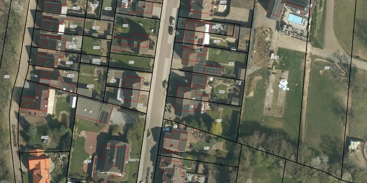 Het perceel waarop Graetheide 65 staat heeft een oppervlakte van 610 m². Dit is een groot perceel. De perceeloppervlakte wordt geregistreerd door het Kadaster. Gedetailleerde informatie over de maten van dit perceel kunt u vinden in het rapport Kadastrale kaart met maatvoering van Graetheide 65.