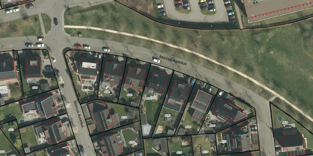 Het perceel waarop Marcus Aurelius 47 staat heeft een oppervlakte van 608 m². Dit is een groot perceel. De perceeloppervlakte wordt geregistreerd door het Kadaster. Gedetailleerde informatie over de maten van dit perceel kunt u vinden in het rapport Kadastrale kaart met maatvoering van Marcus Aurelius 47.